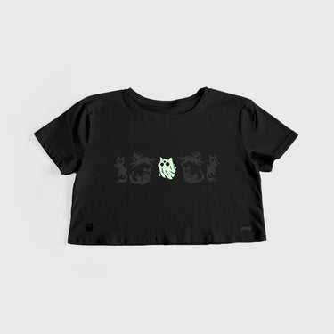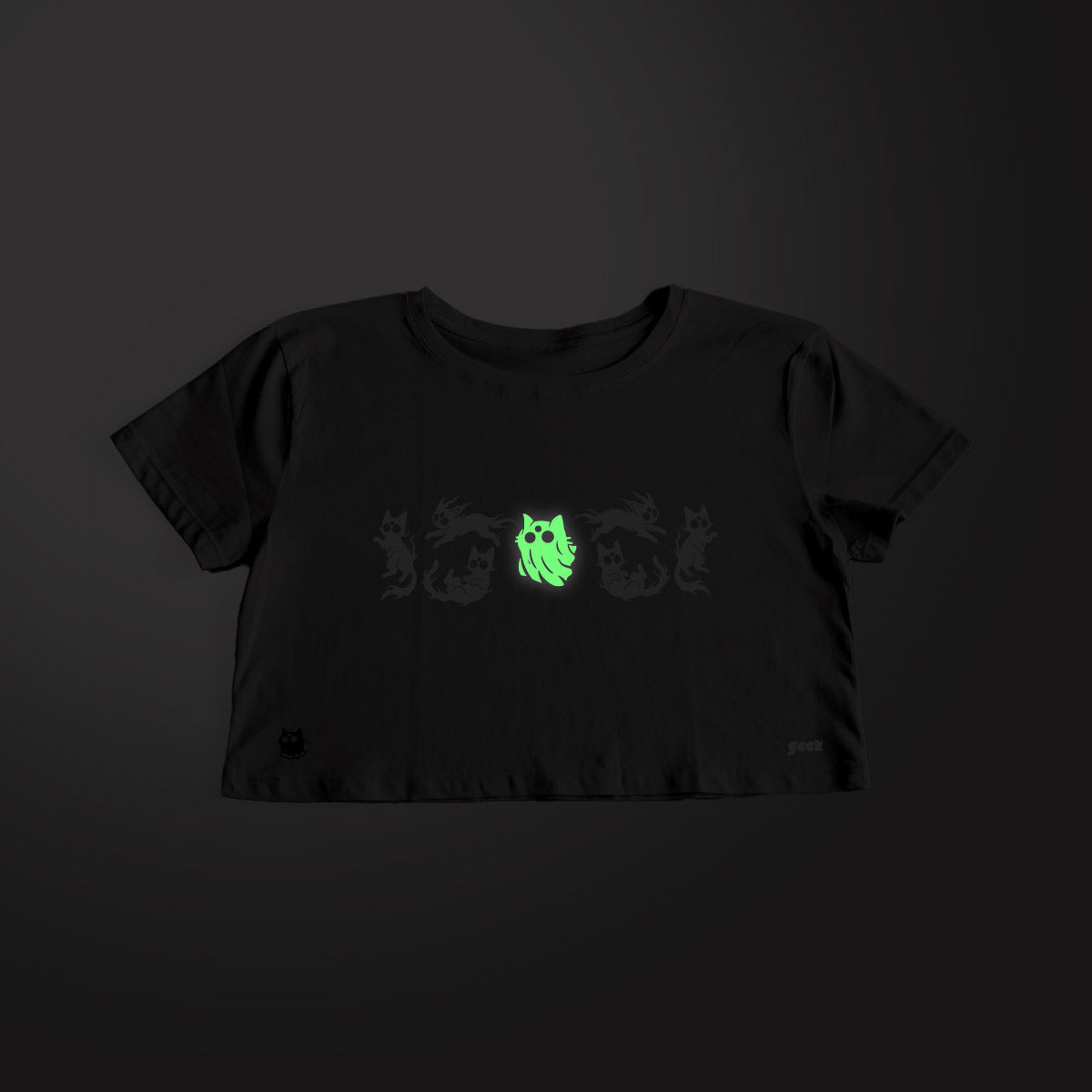 Los ojos de los gatos en la camiseta negra brillan en la oscuridad.